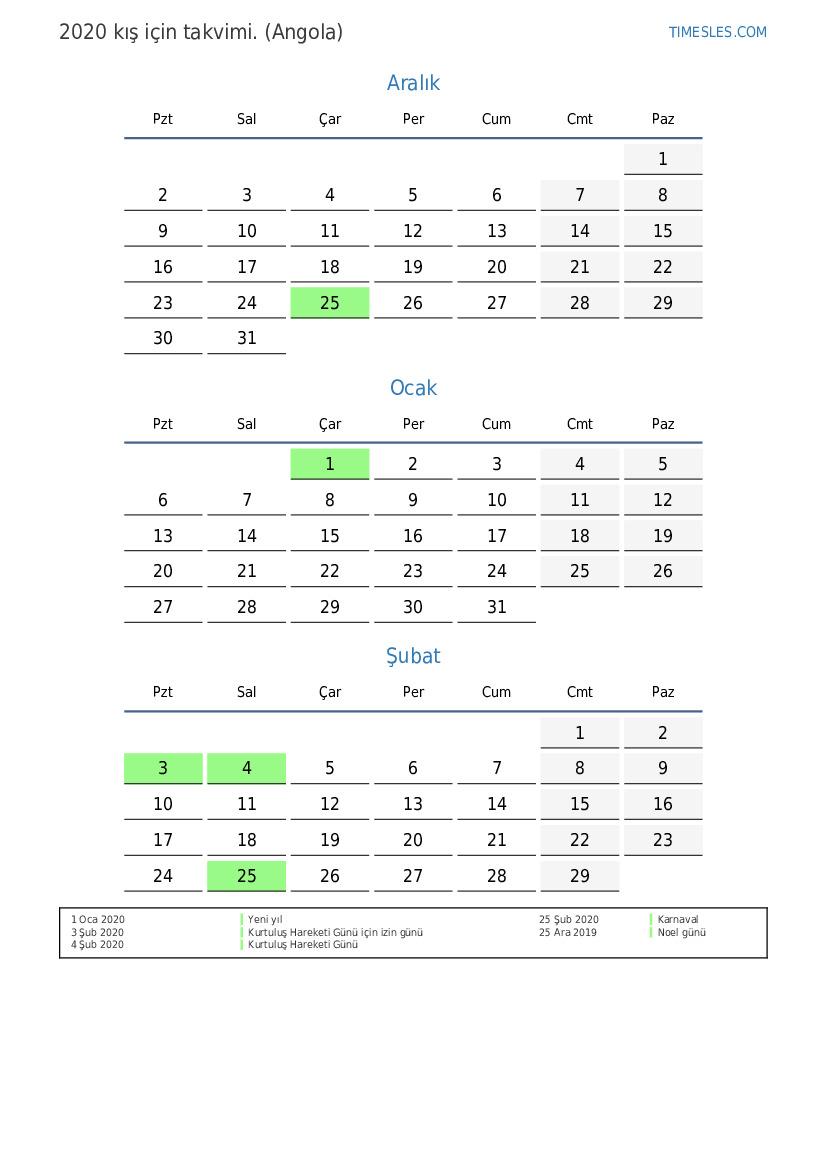 Angola için 2020 kış için tatiller ve hafta sonları içeren PDF takvimini indirin ve yazdırın