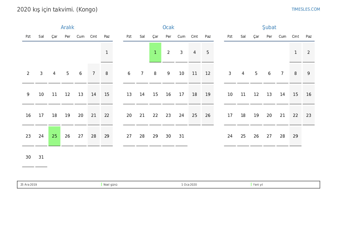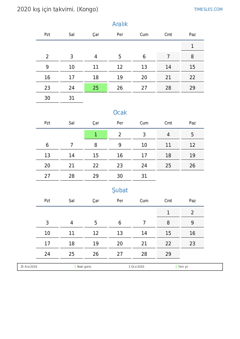 Kongo için 2020 kış için tatiller ve hafta sonları içeren PDF takvimini indirin ve yazdırın