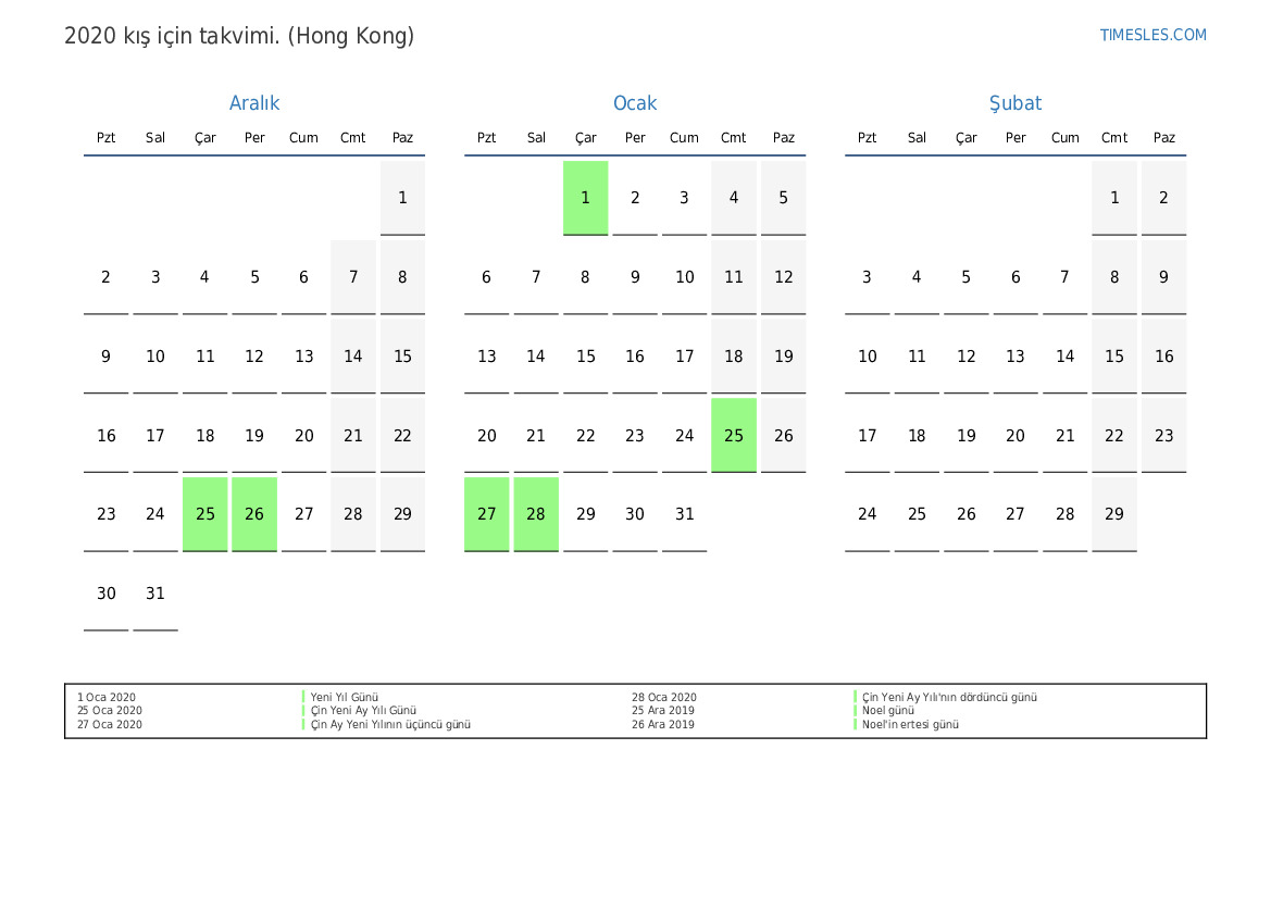 Hong Kong için 2020 kış için tatiller ve hafta sonları içeren PDF takvimini indirin ve yazdırın