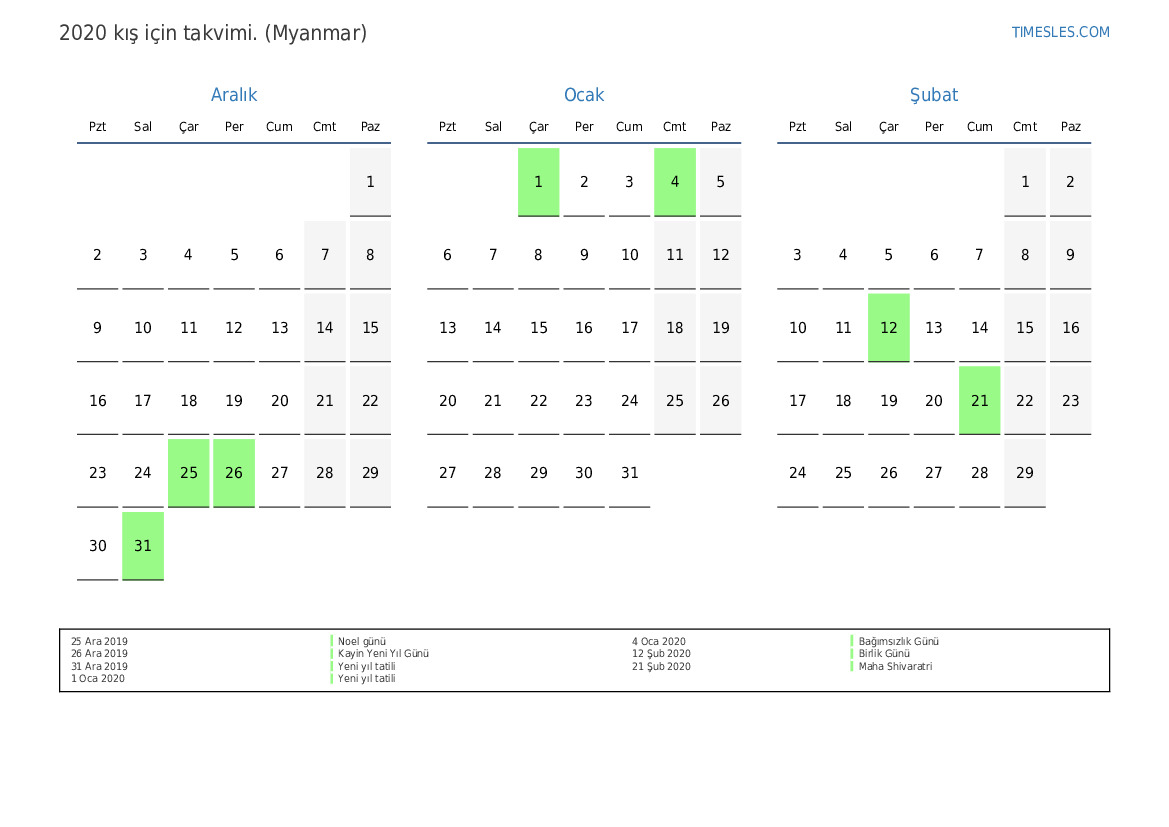 Myanmar için 2020 kış için tatil ve hafta sonları takvimi