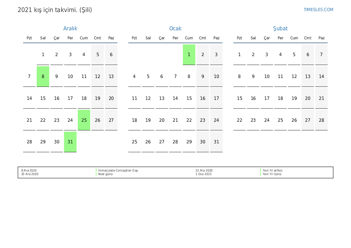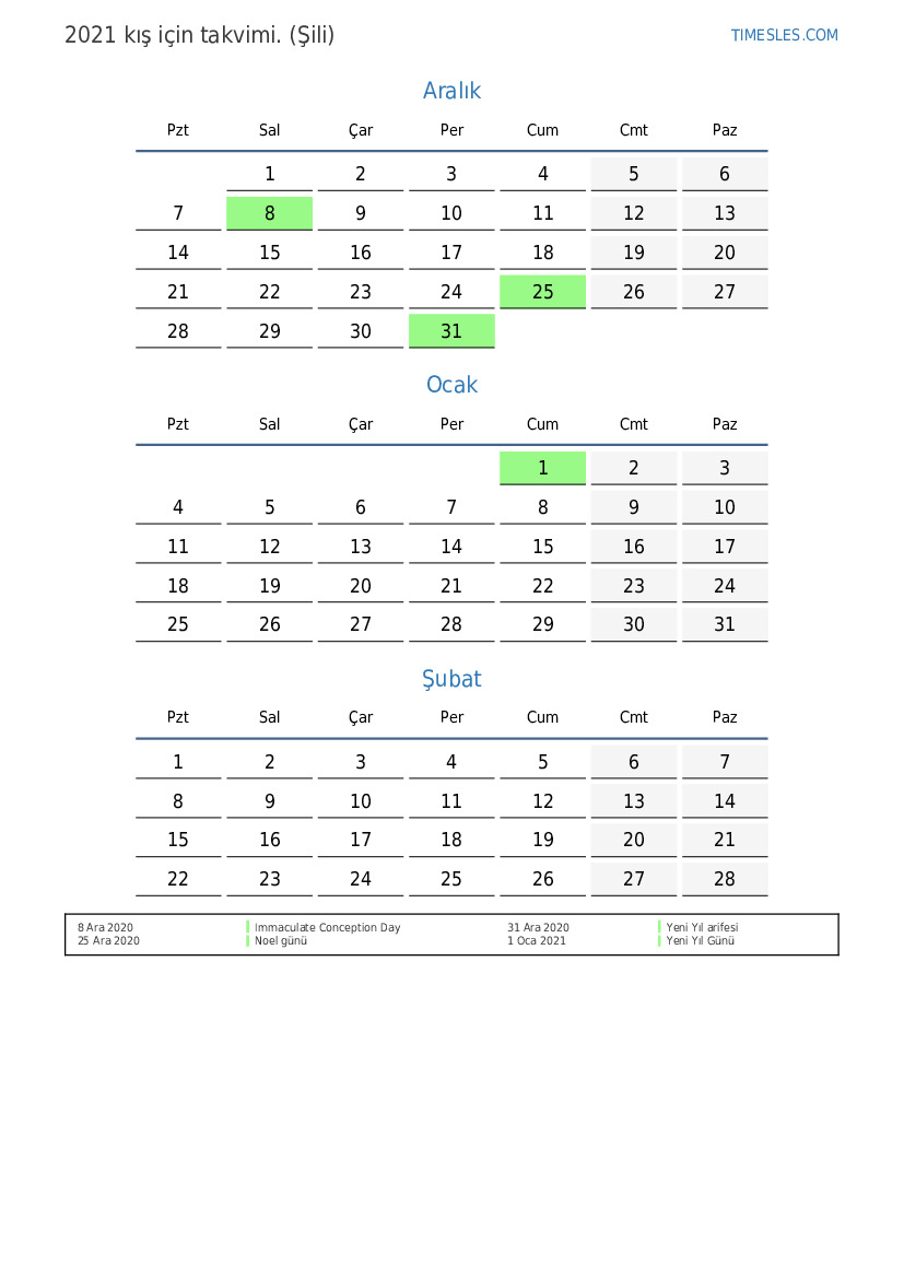 Şili için 2021 kış için tatiller ve hafta sonları içeren PDF takvimini indirin ve yazdırın