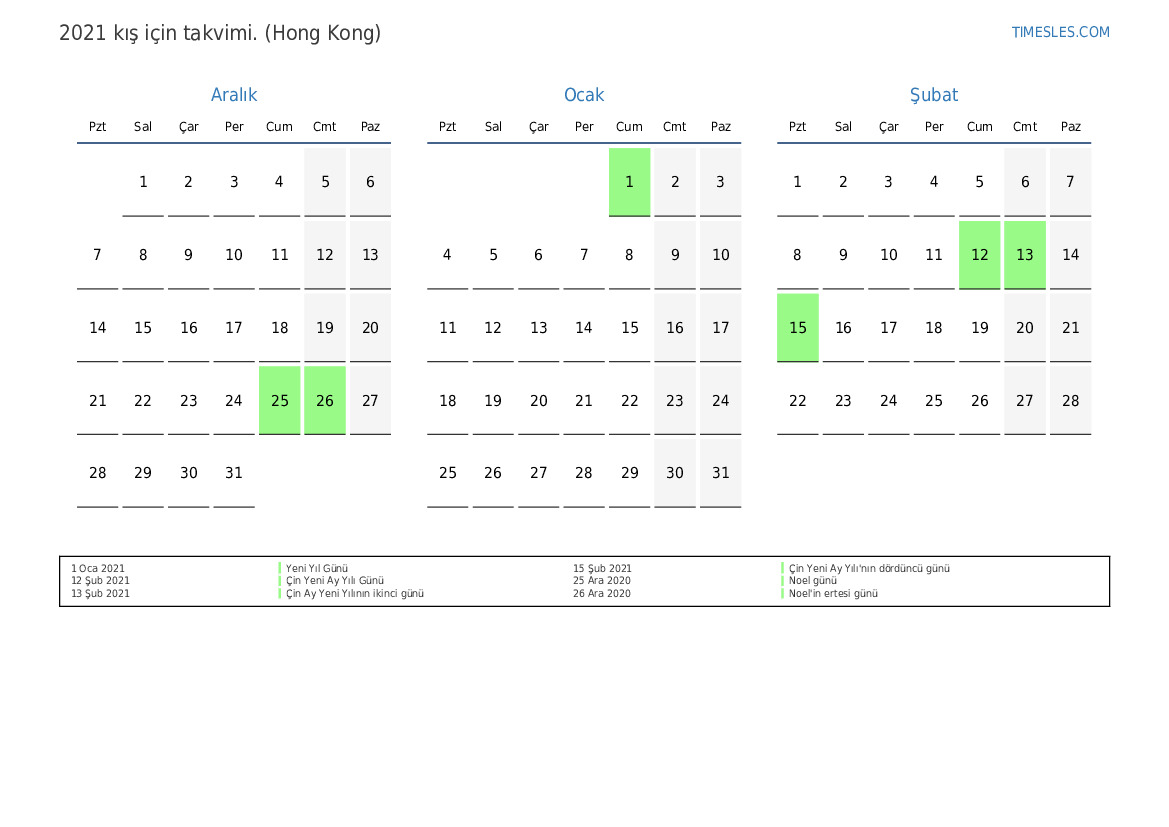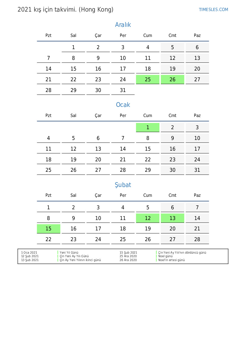 Hong Kong için 2021 kış için tatiller ve hafta sonları içeren PDF takvimini indirin ve yazdırın