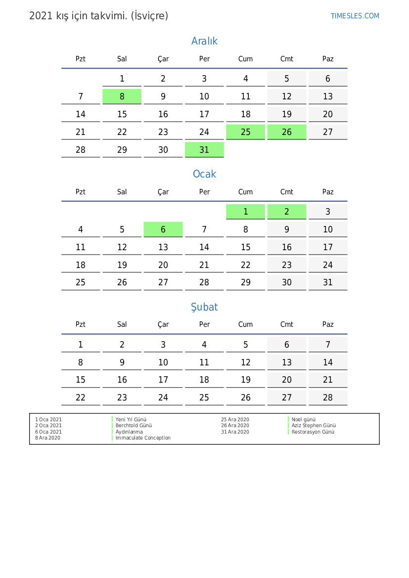 İsviçre için 2021 kış için tatiller ve hafta sonları içeren PDF takvimini indirin ve yazdırın