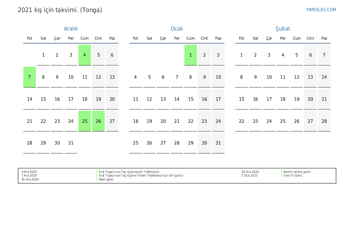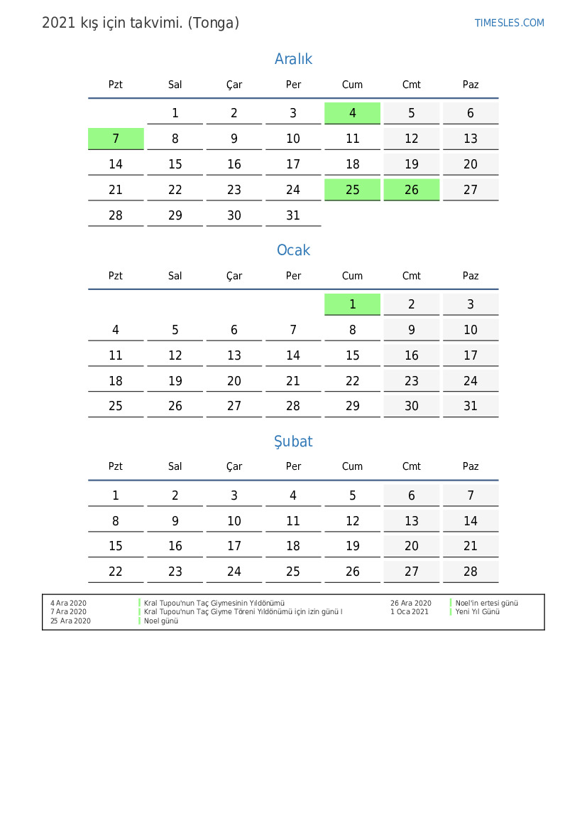 Tonga için 2021 kış için tatiller ve hafta sonları içeren PDF takvimini indirin ve yazdırın