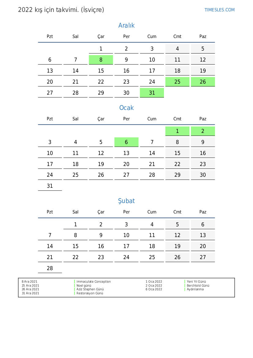 İsviçre için 2022 kış için tatil ve hafta sonları takvimi