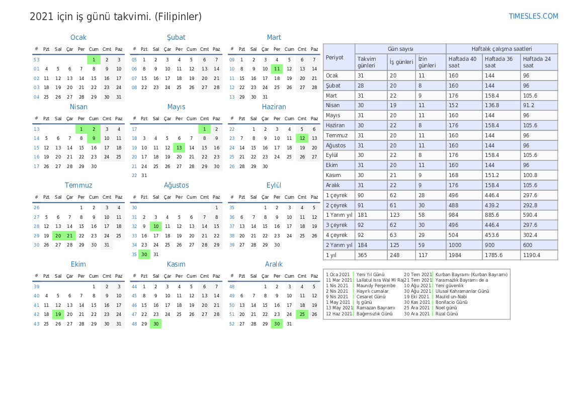 Filipinler için Mayıs 2021 için PDF iş günü takvimini indirin ve yazdırın
