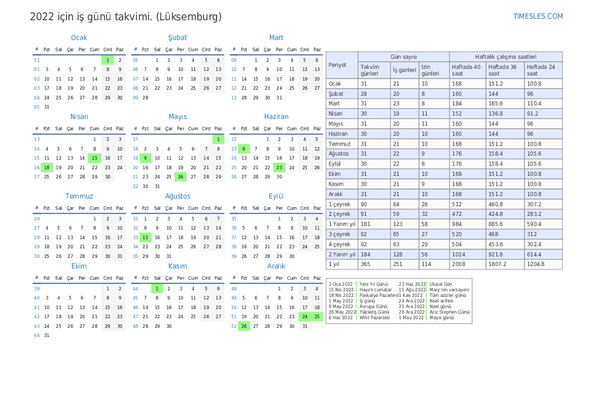 Lüksemburg için Ağustos 2022 için PDF iş günü takvimini indirin ve yazdırın