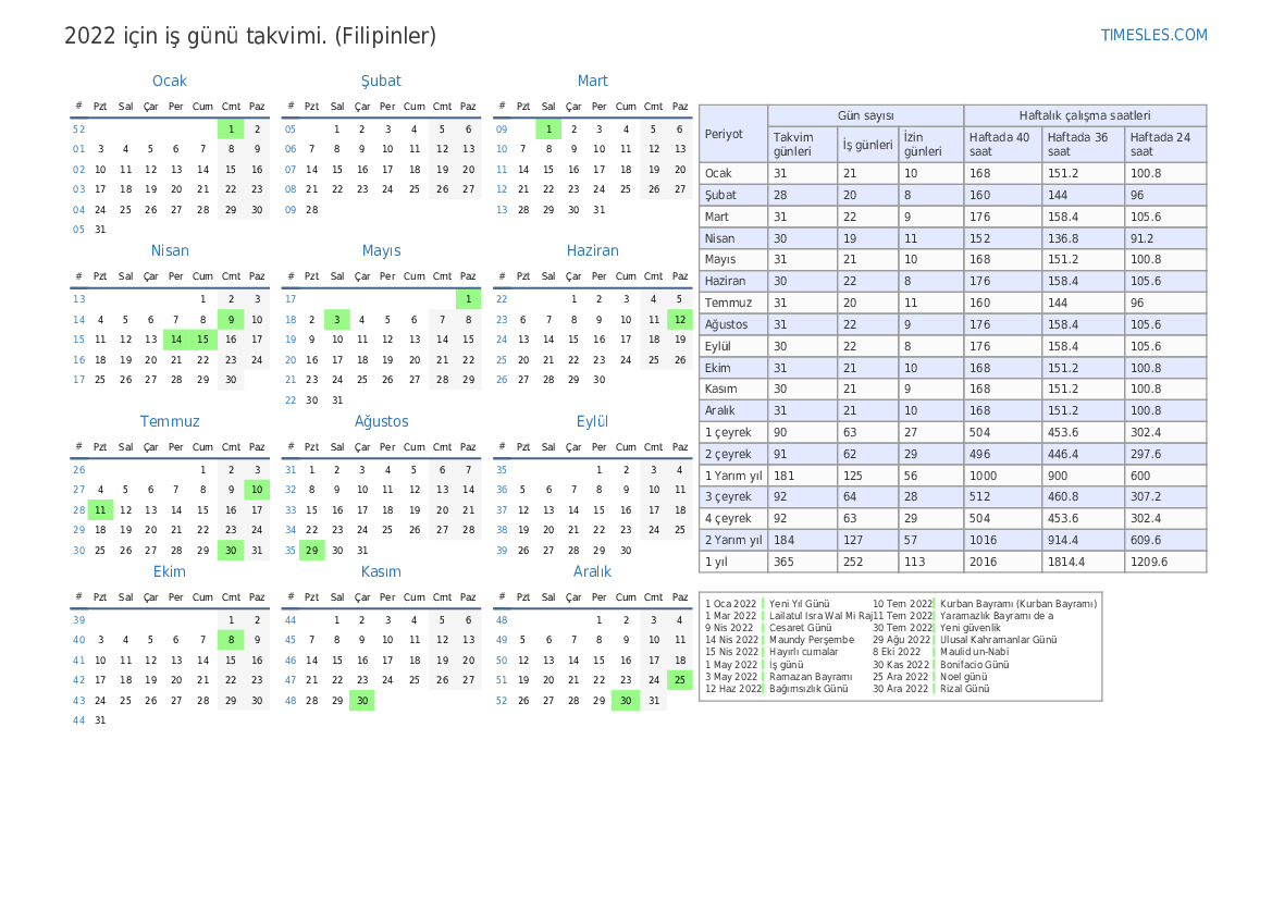 Filipinler için Kasım 2022 için PDF iş günü takvimini indirin ve yazdırın