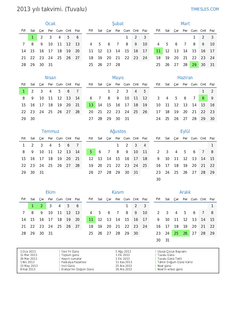 2 Eki 2013 Tuvalu Günü Tatili