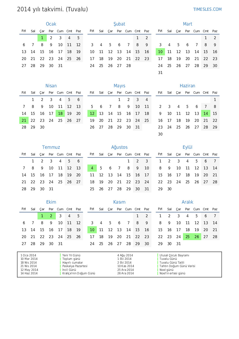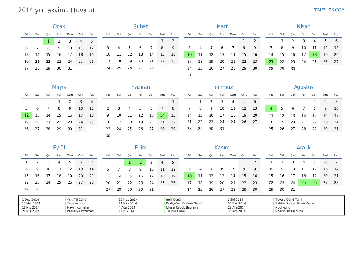 2 Eki 2014 Tuvalu Günü Tatili