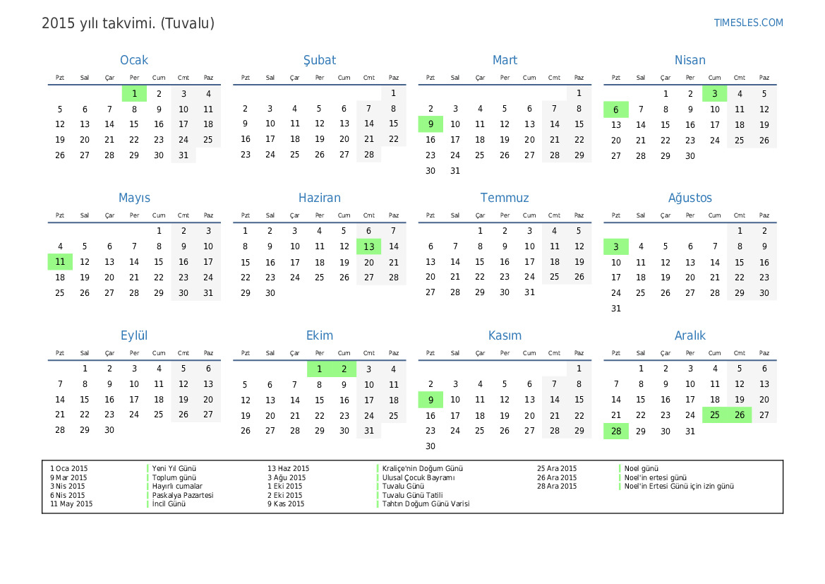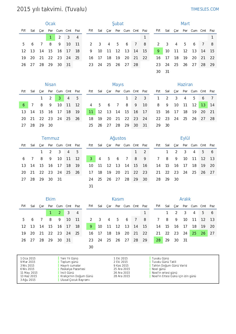 2 Eki 2015 Tuvalu Günü Tatili
