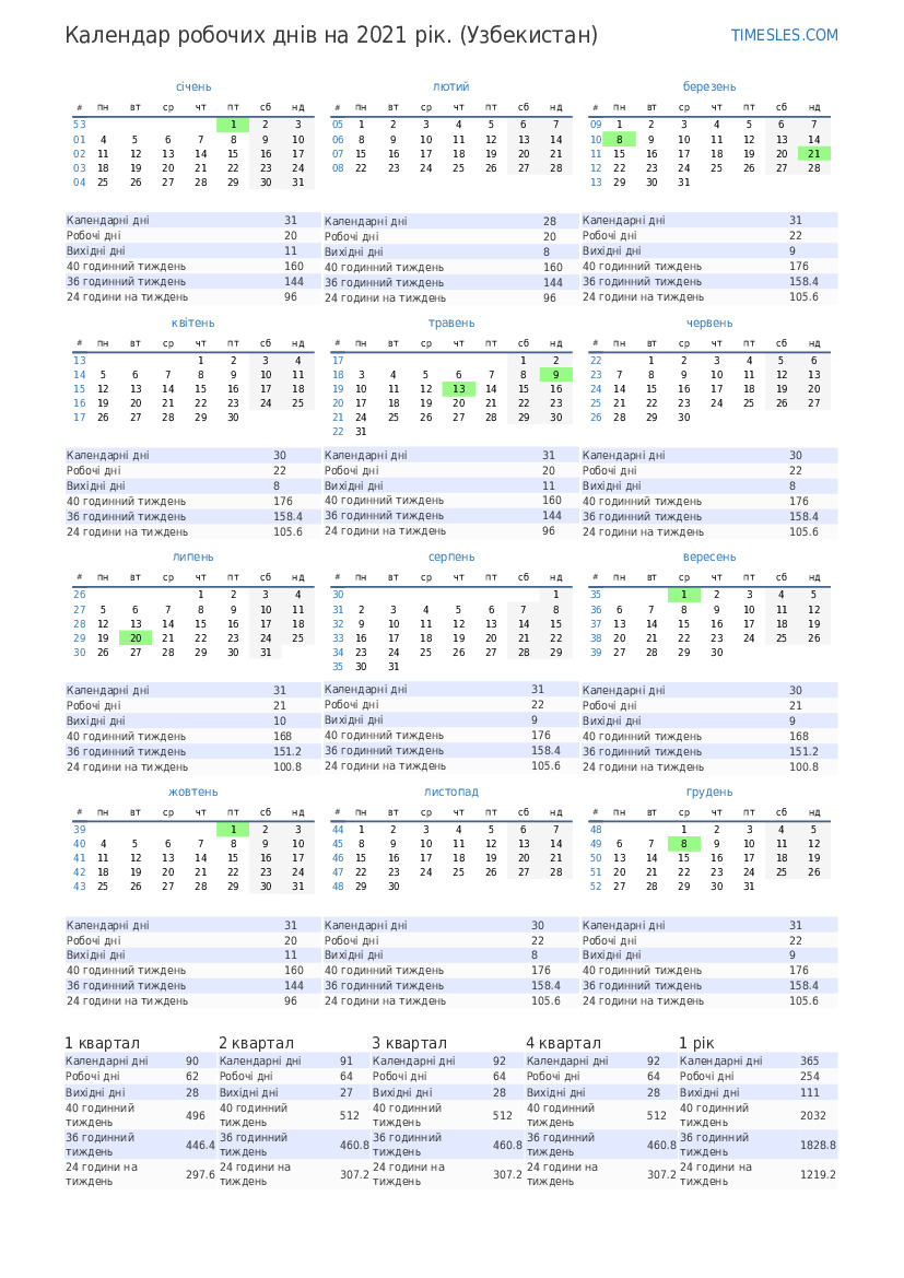 Календар робочих днів на грудень 2021 року для Узбекистану