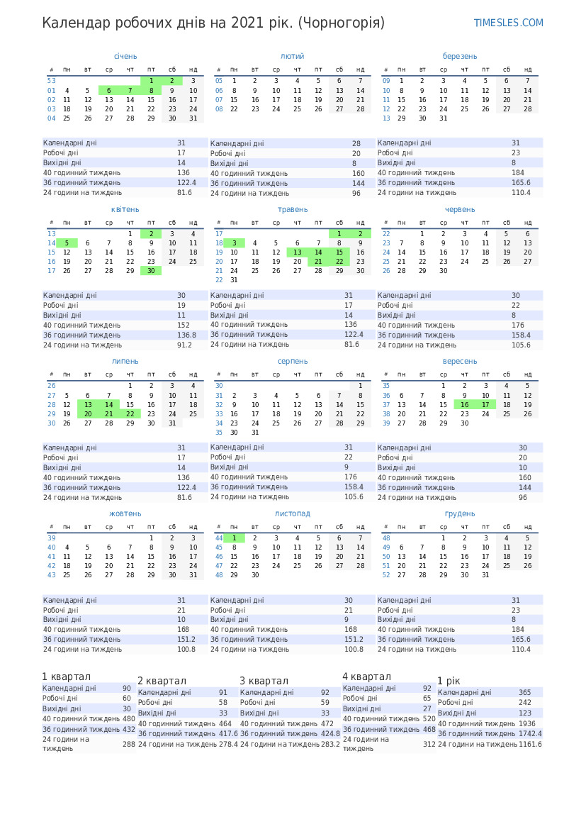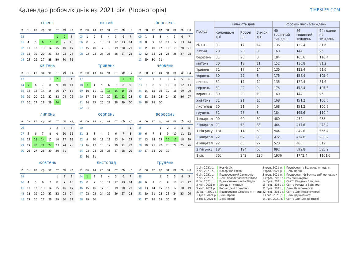 Календар 1 кварталу 2021 р. для Чорногорії