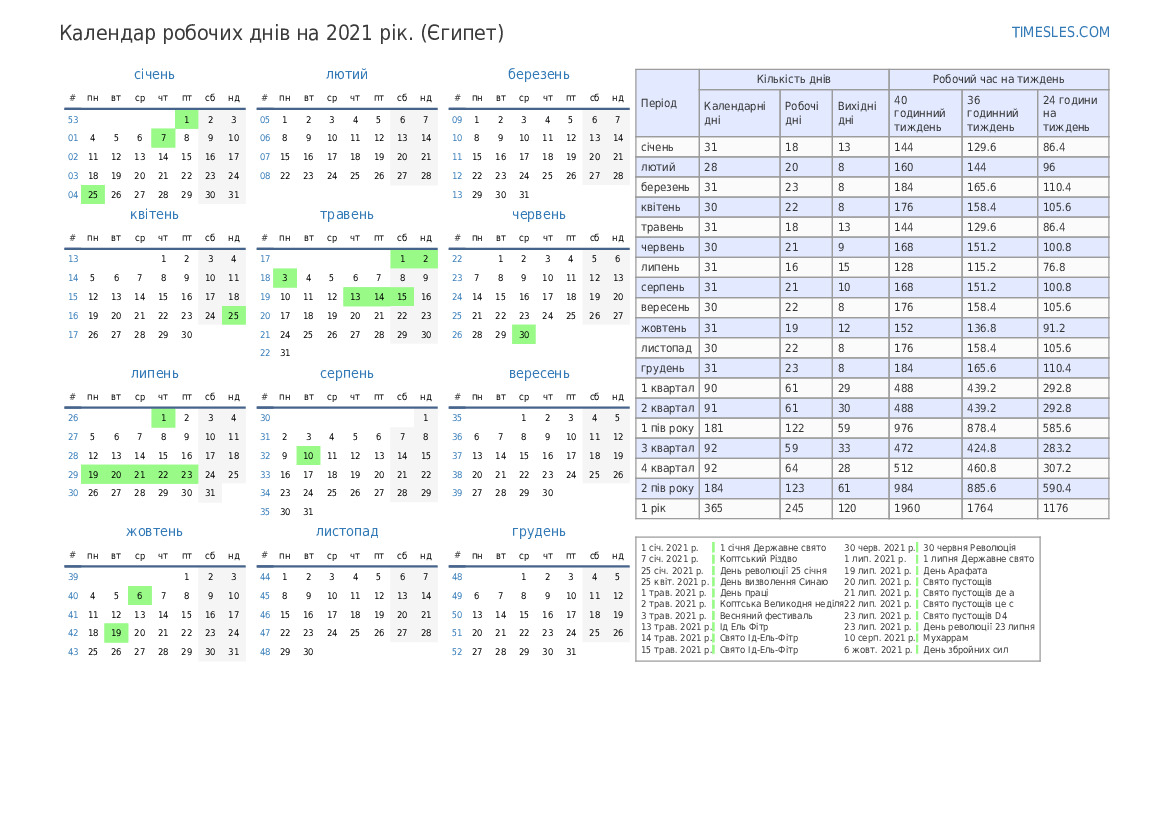 Календар робочих днів зі святами та вихідними на 4 квартал 2021 року для Єгипту