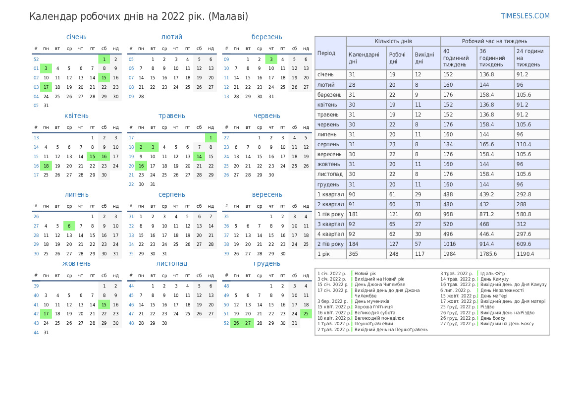 Календар робочих днів зі святами та вихідними на 3 квартал 2022 року для Малаві