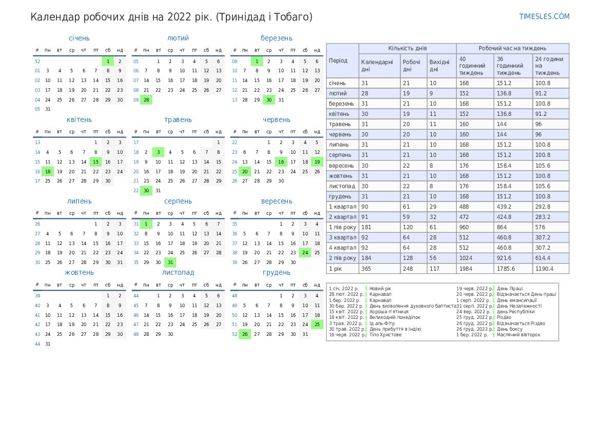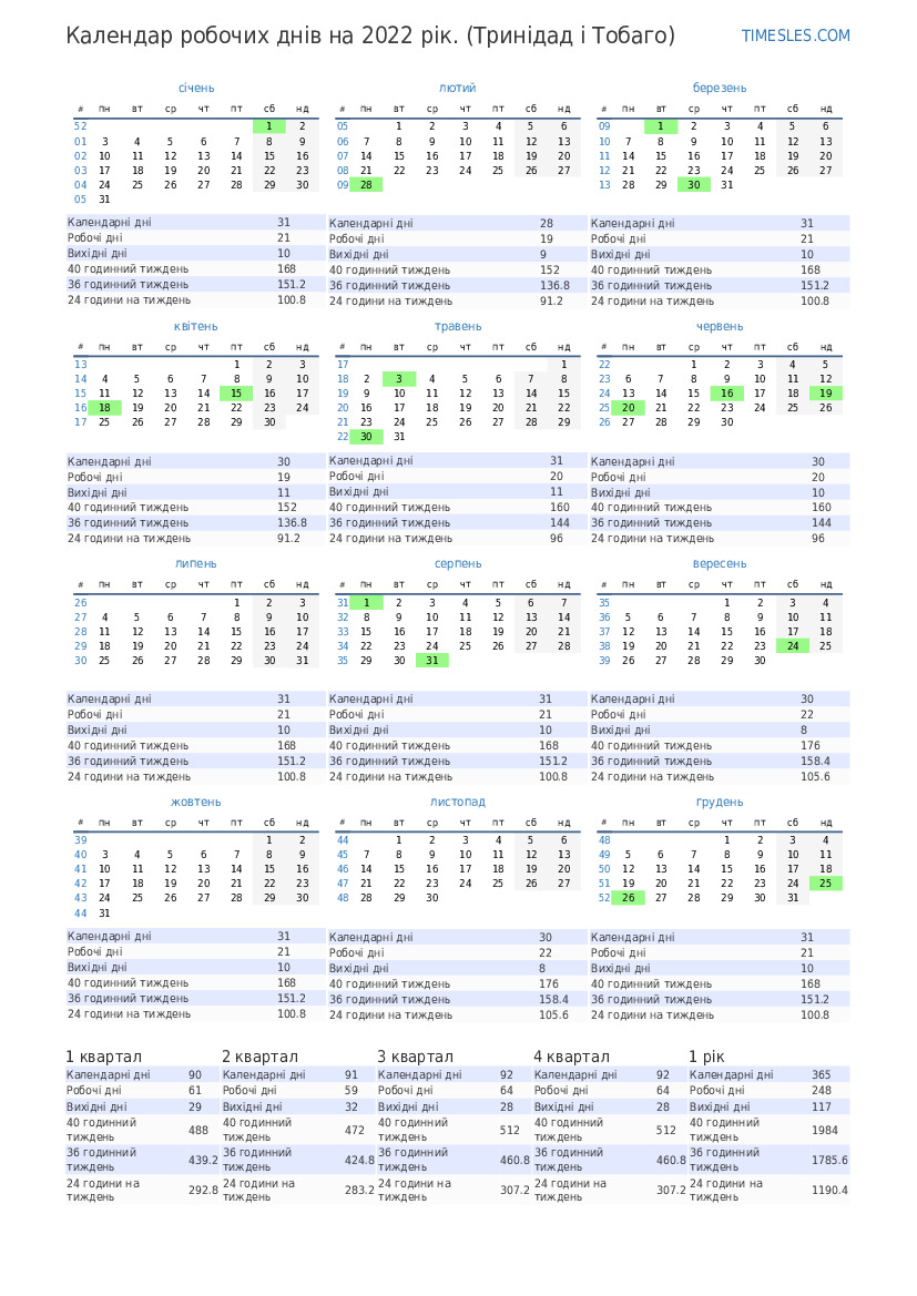 Календар робочих днів зі святами та вихідними на 4 квартал 2022 року для Тринідаду та Тобаго