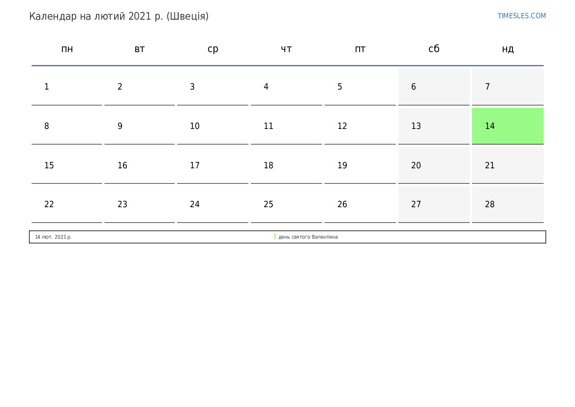 Завантажте та роздрукуйте календар PDF зі святами та вихідними на лютий 2021 року для Швеції