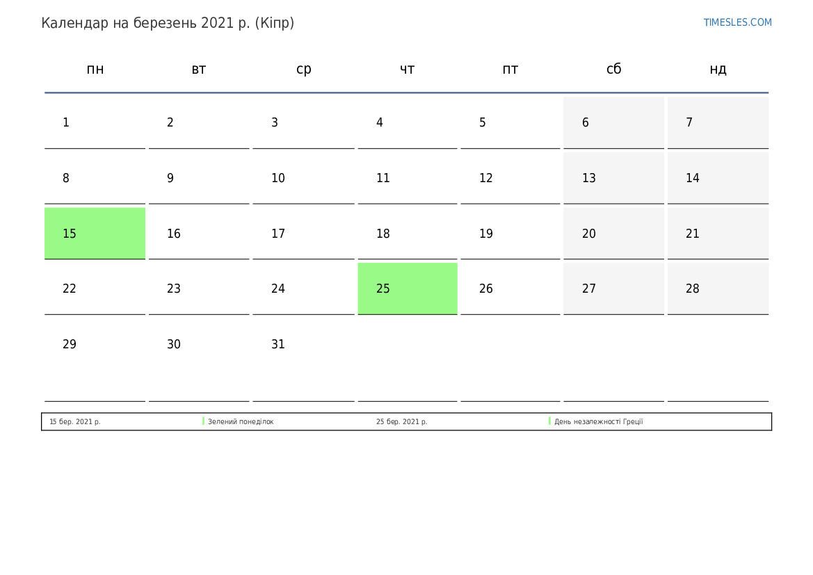 Календар свят та вихідних на березень 2021 року для Кіпру