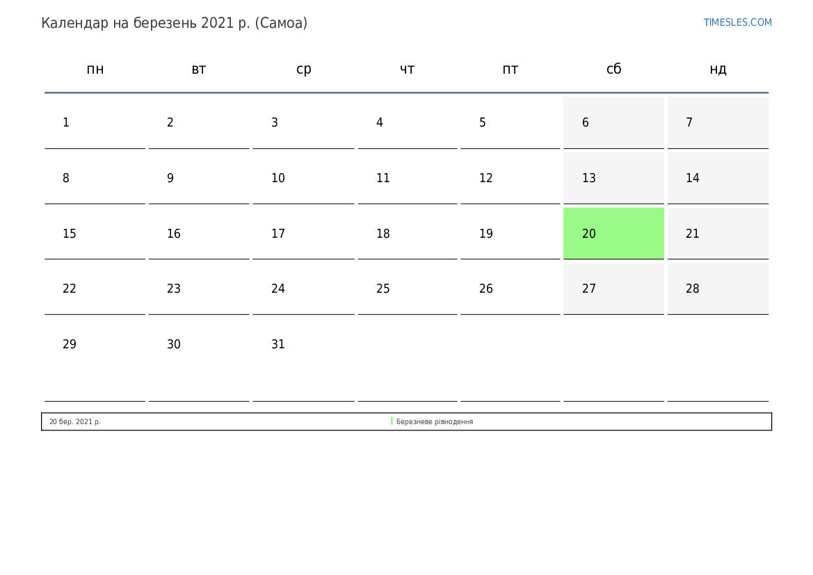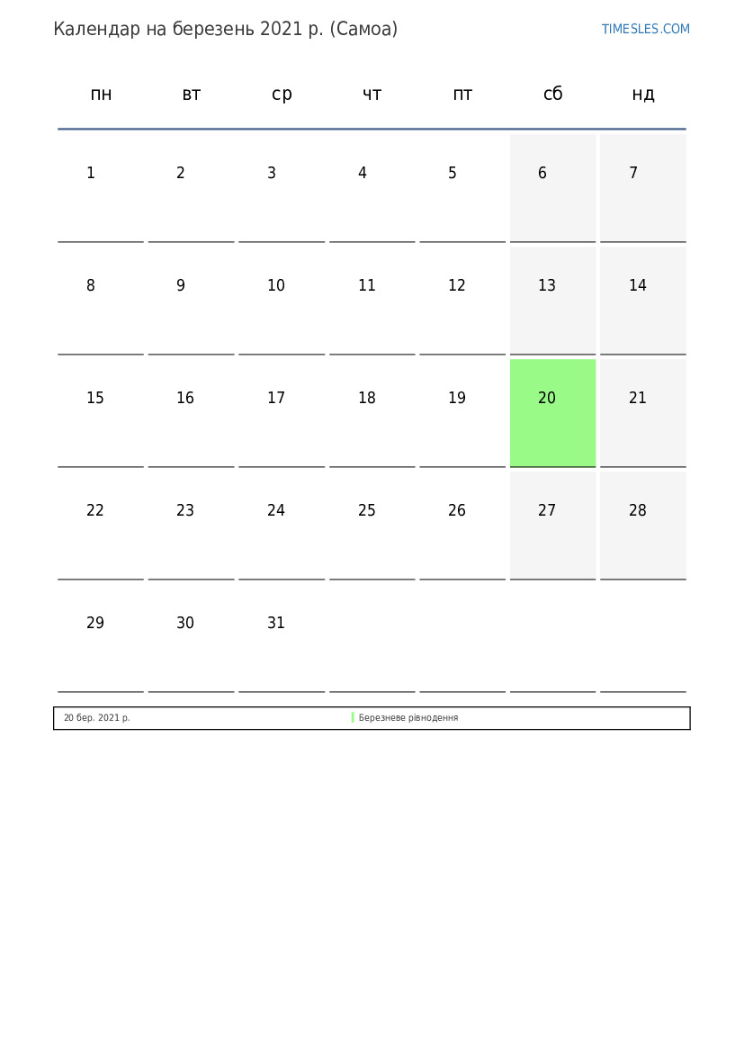 Завантажте та роздрукуйте календар PDF зі святами та вихідними на березень 2021 року для Самоа