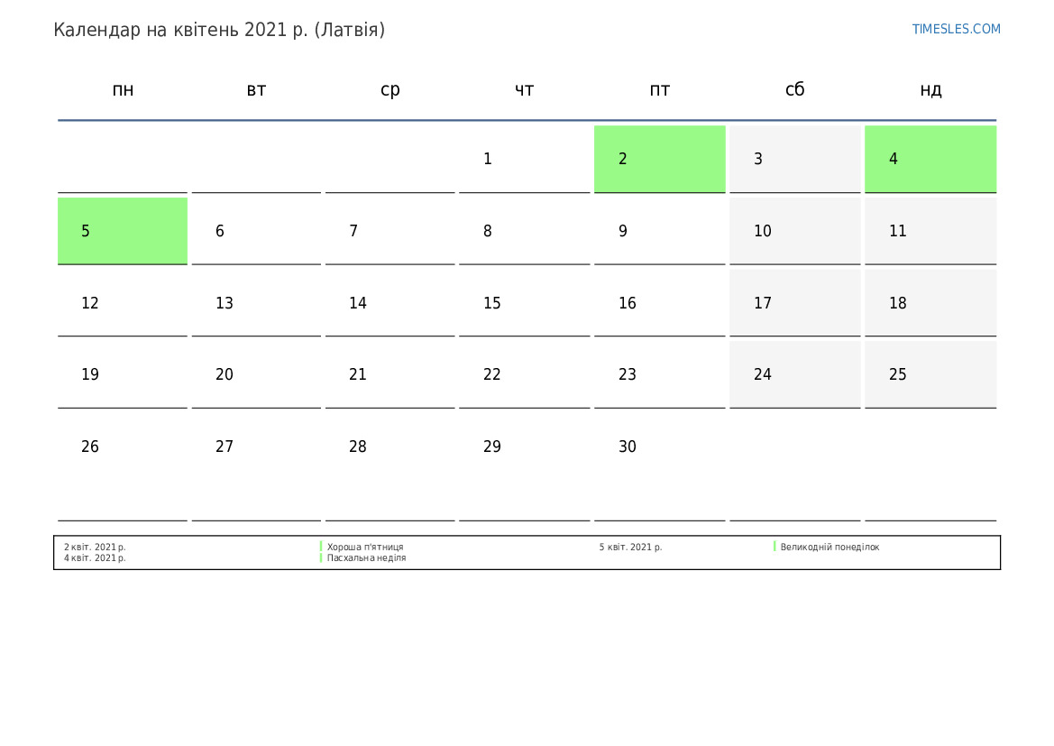 Завантажте та роздрукуйте календар PDF зі святами та вихідними на квітень 2021 року для Латвії
