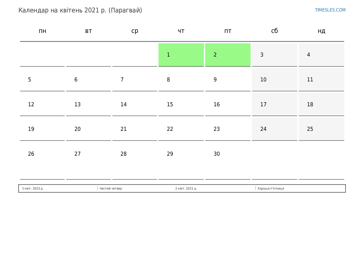 Завантажте та роздрукуйте календар PDF зі святами та вихідними на квітень 2021 року для Парагваю