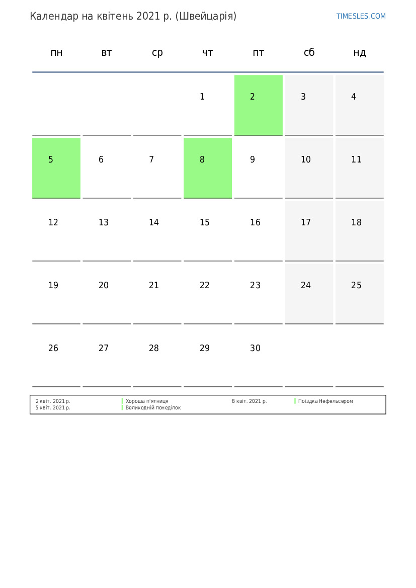 Календар свят та вихідних на квітень 2021 року для Швейцарії