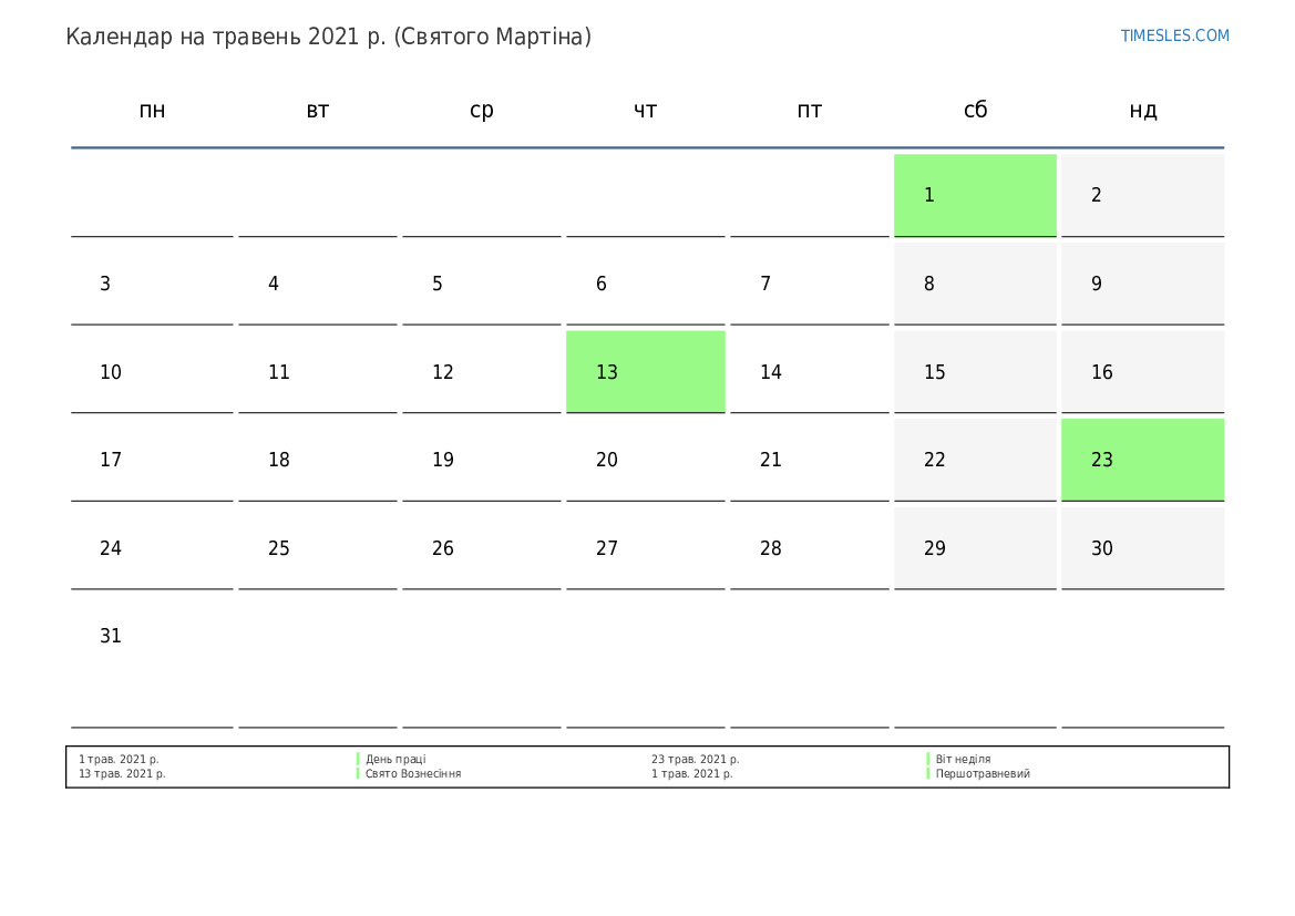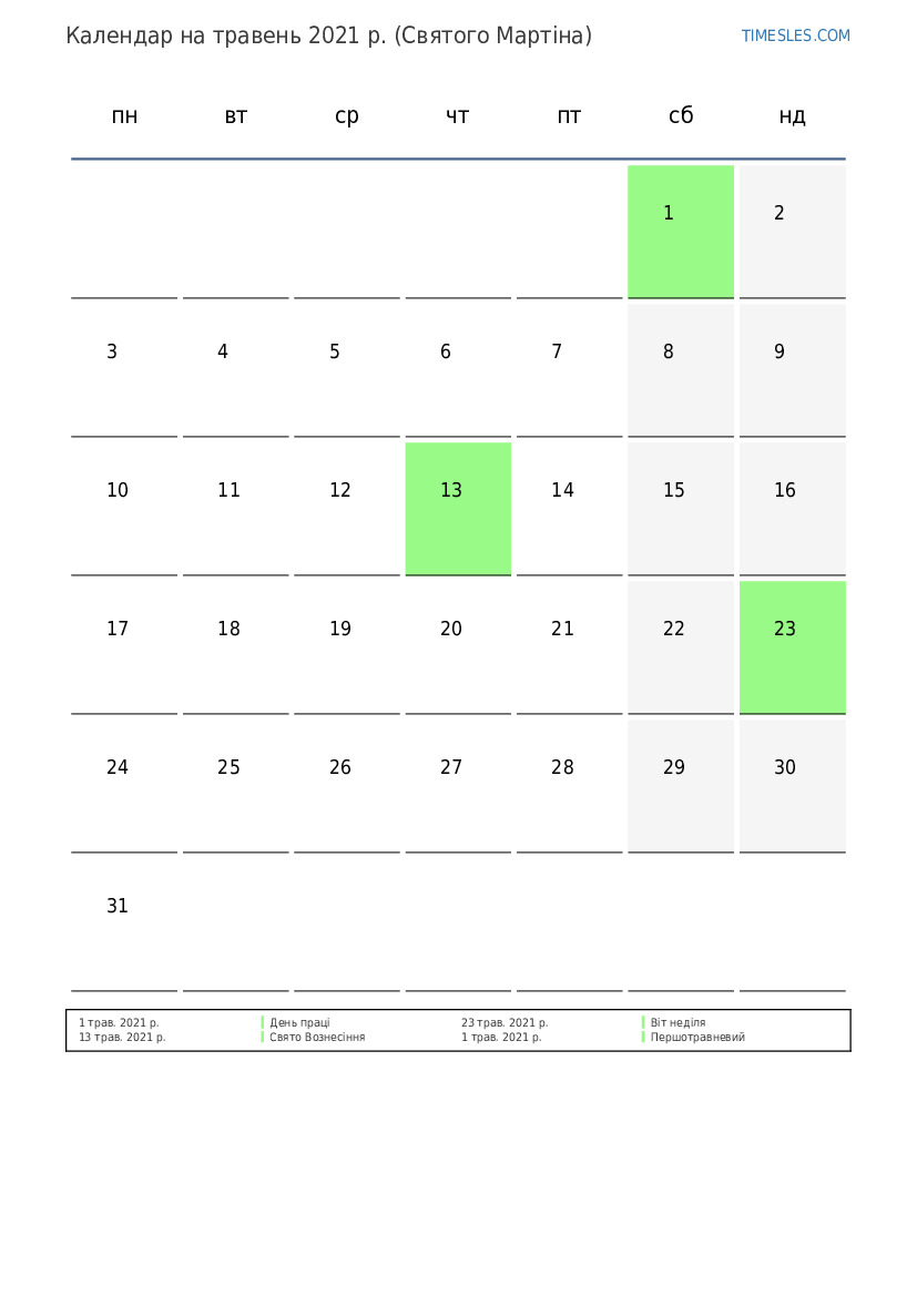травень містить 31 день. Це 5 місяць 2021 року. Сезон року: весна. травень починається в суботу і закінчується в понеділок. У січні 2021 року у Сінт-Мартені 4 свят та вихідні.