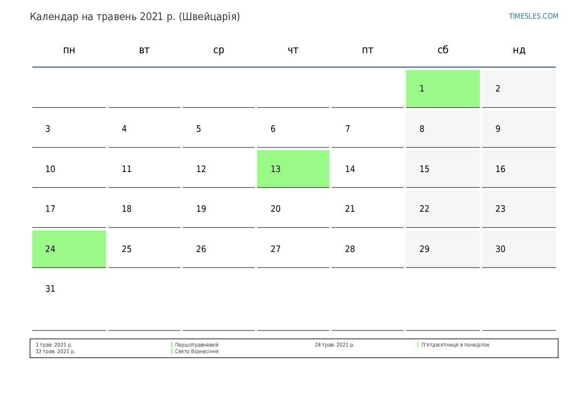 Календар свят та вихідних на травень 2021 року для Швейцарії