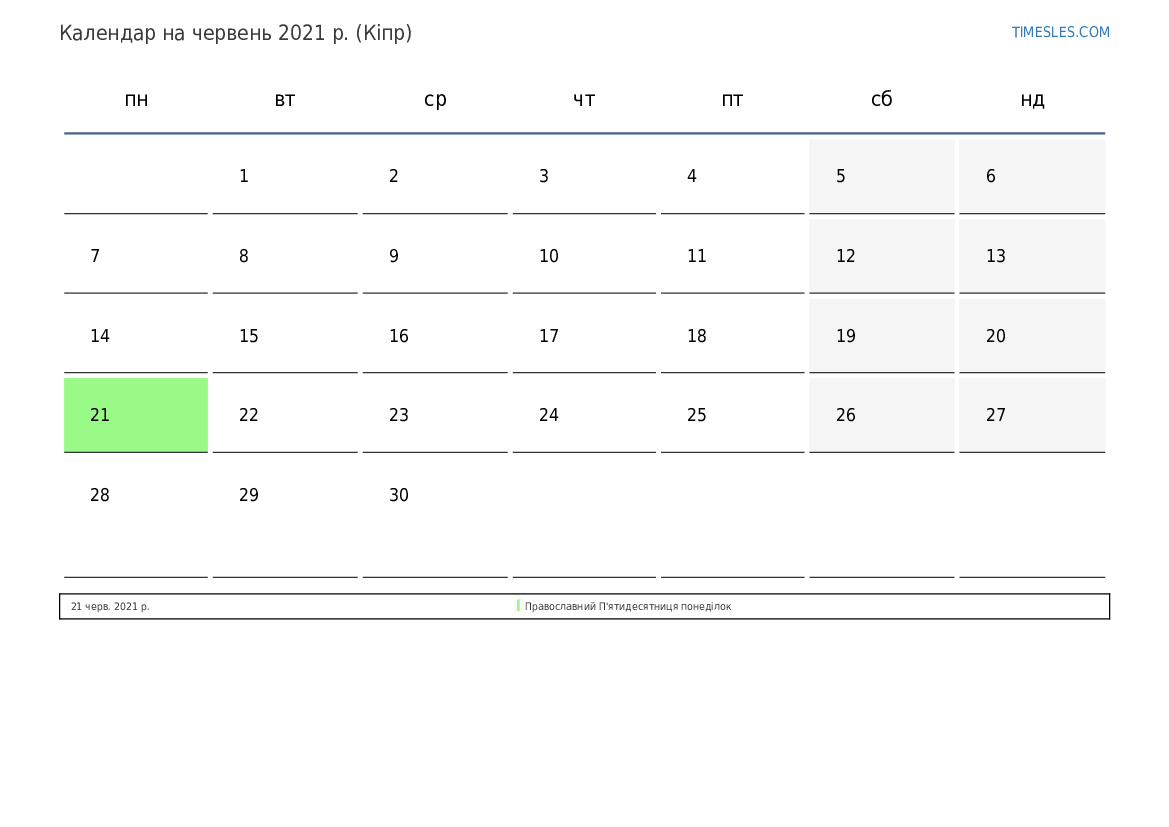 Календар свят та вихідних на червень 2021 року для Кіпру