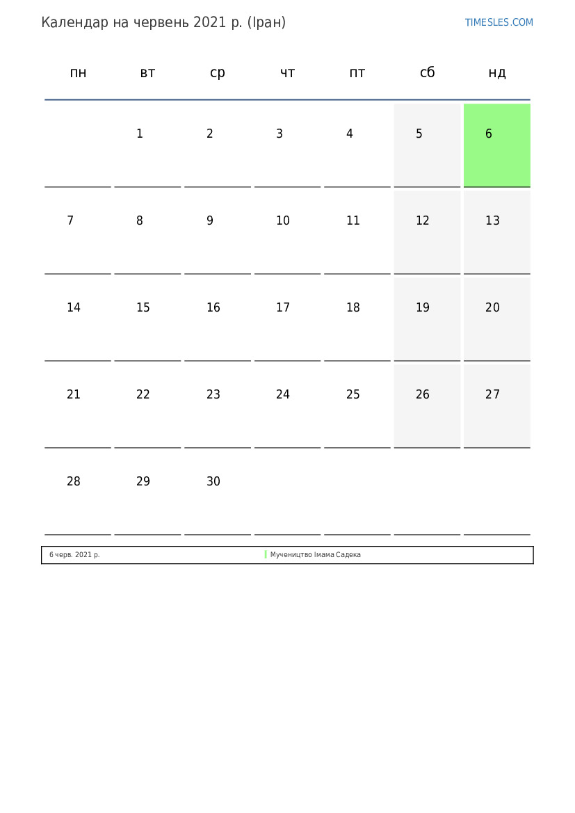 Завантажте та роздрукуйте календар PDF зі святами та вихідними на червень 2021 року для Ірану