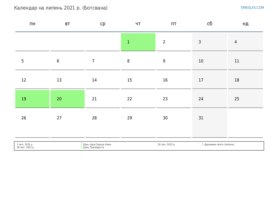 Календар свят та вихідних на липень 2021 року для Ботсвани