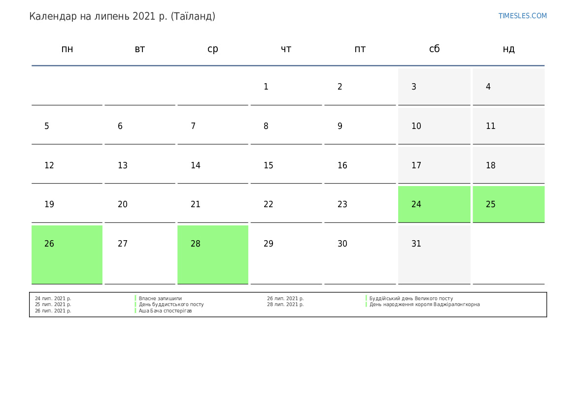 Календар на липень 2021 року для Таїланду