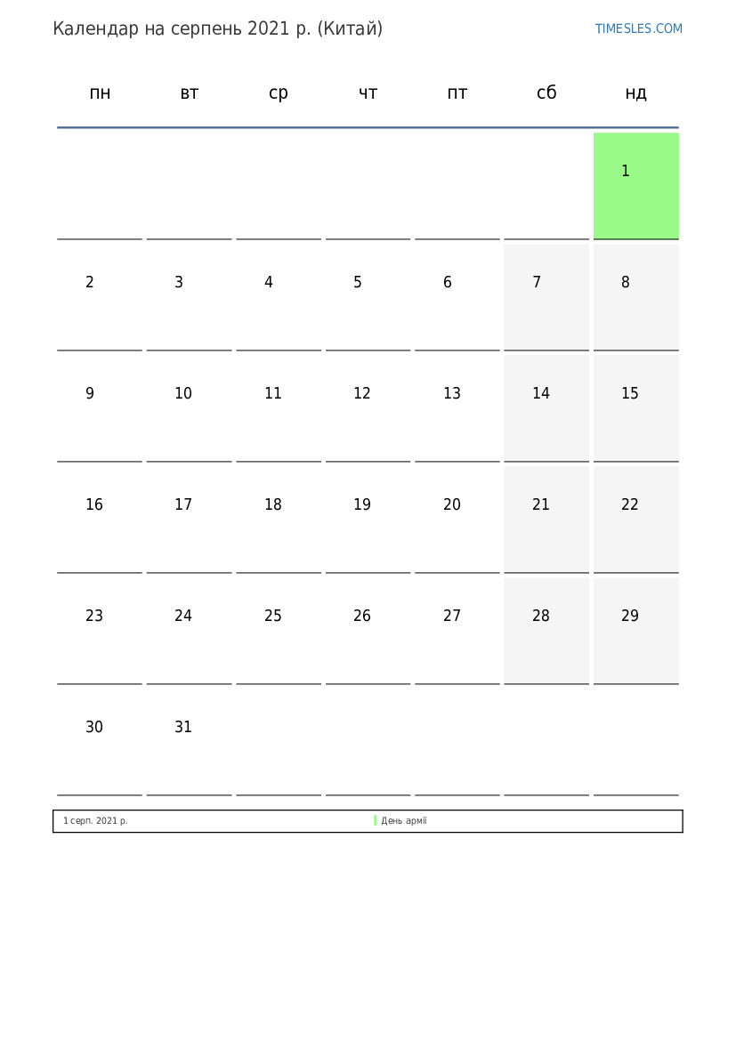 Завантажте та роздрукуйте календар PDF зі святами та вихідними на серпень 2021 року для Китаю