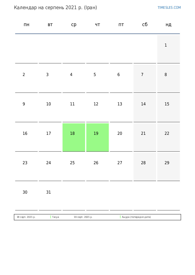 Календар на серпень 2021 року для Ірану