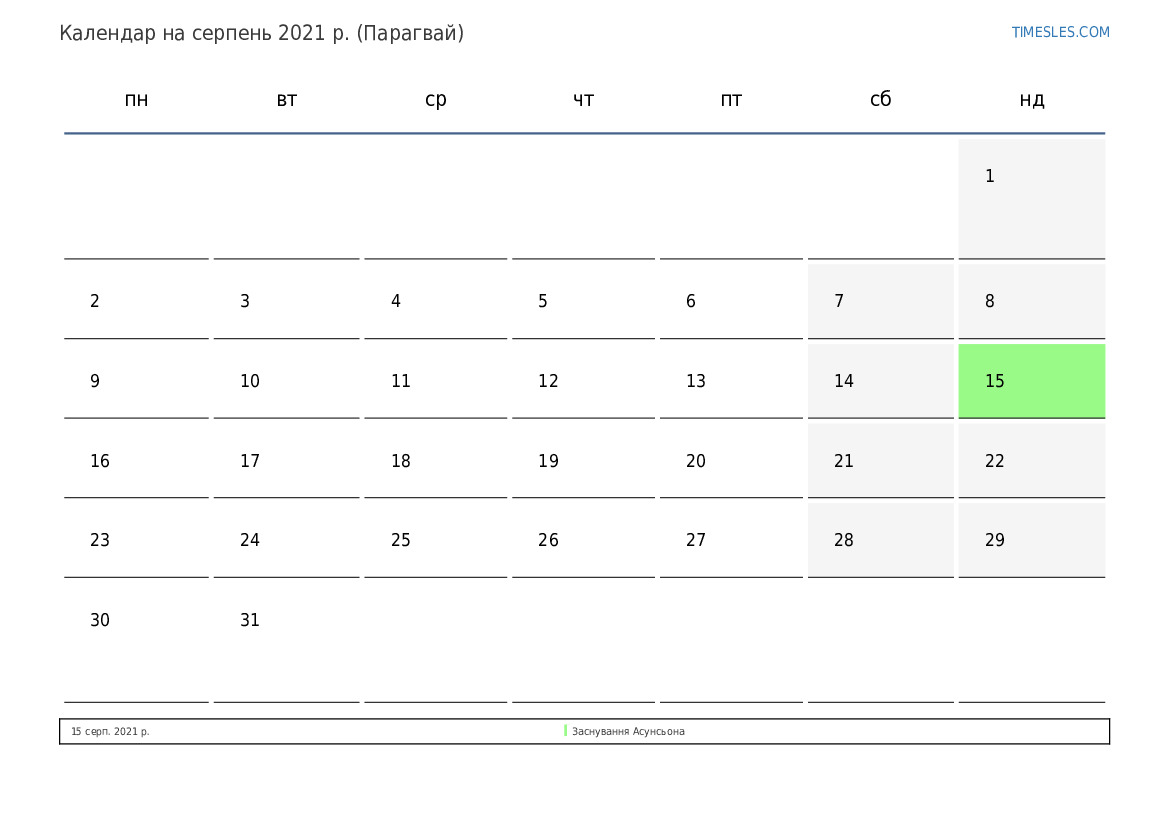 Календар свят та вихідних на серпень 2021 року для Парагваю