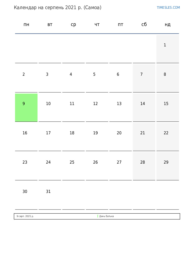 серпень містить 31 день. Це 8 місяць 2021 року. Сезон року: літо. серпень починається в неділю і закінчується у вівторок. У січні 2021 року на Самоа 1 свято та вихідний.