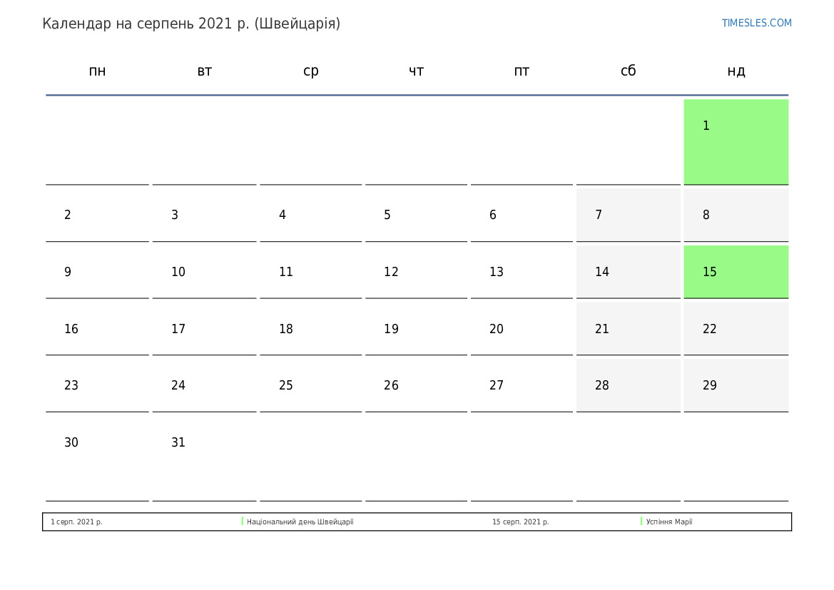 Завантажте та роздрукуйте календар PDF зі святами та вихідними на серпень 2021 року для Швейцарії
