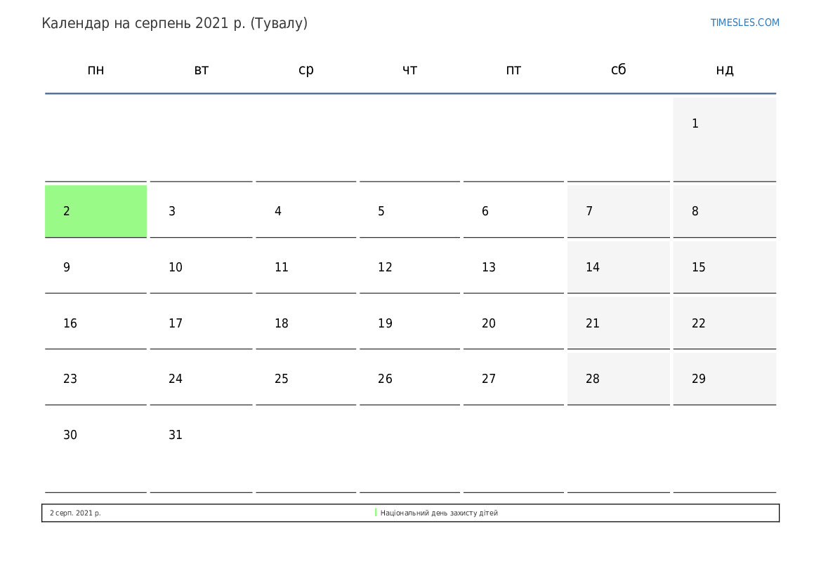 Календар на серпень 2021 року для Тувалу