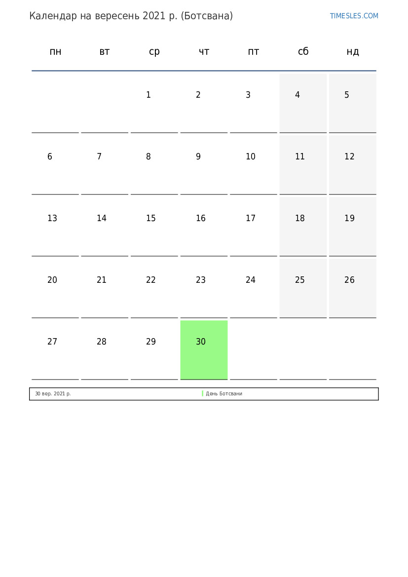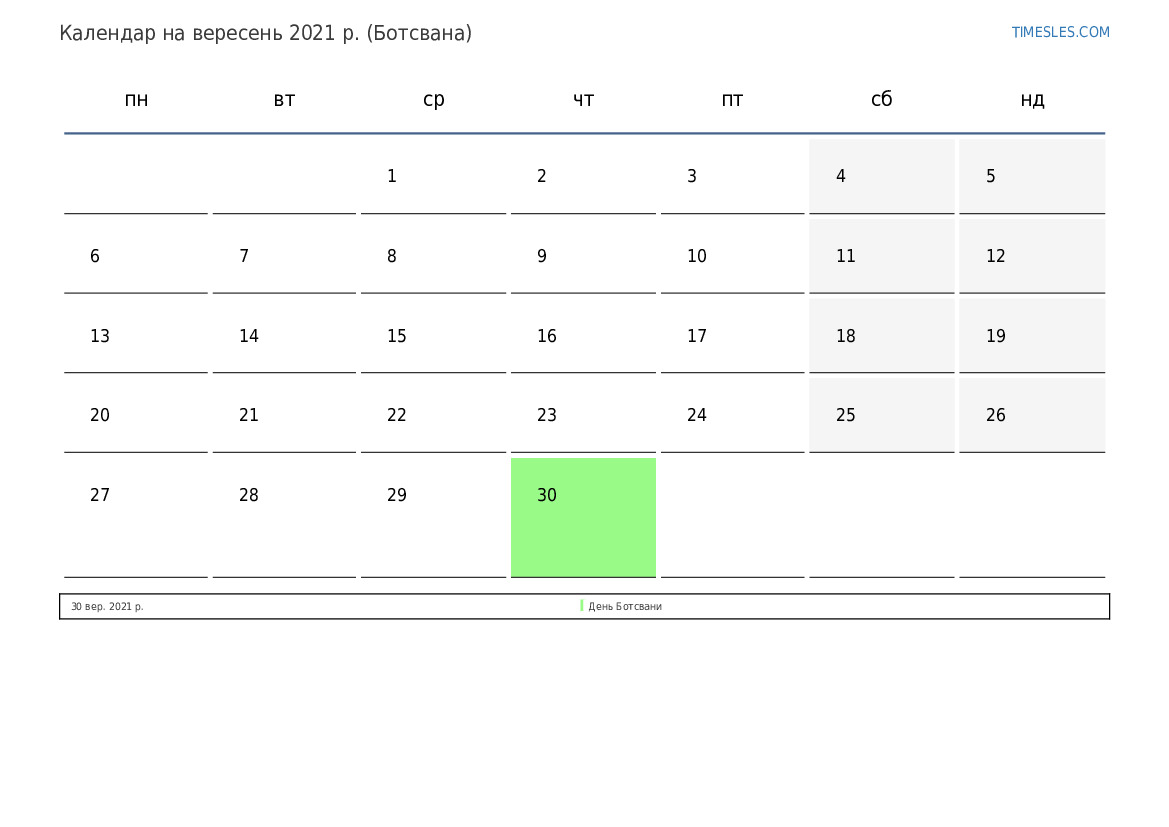 Завантажте та роздрукуйте календар PDF зі святами та вихідними на вересень 2021 року для Ботсвани