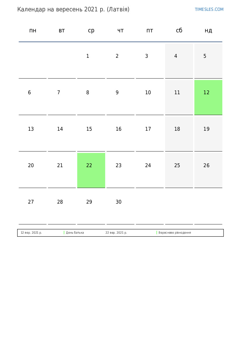 Завантажте та роздрукуйте календар PDF зі святами та вихідними на вересень 2021 року для Латвії