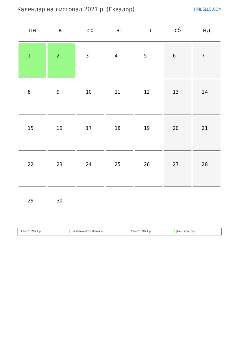 Завантажте та роздрукуйте календар PDF зі святами та вихідними на листопад 2021 року для Еквадору
