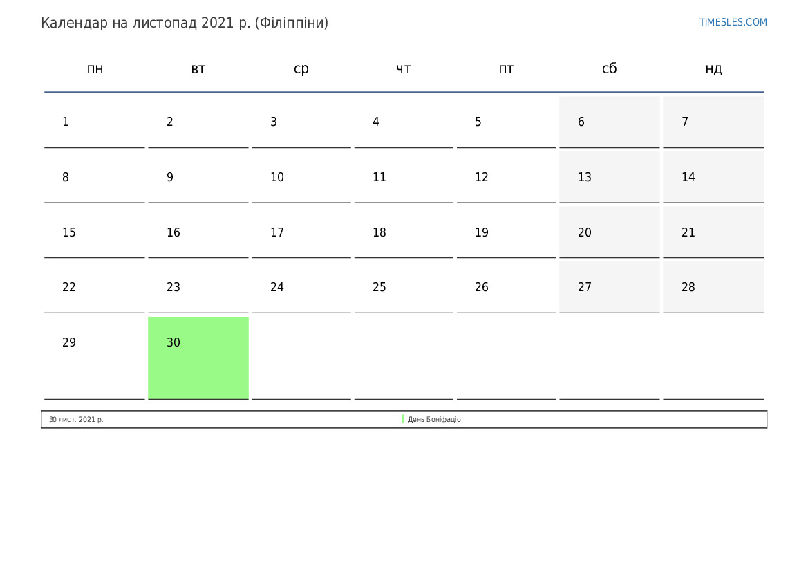 Завантажте та роздрукуйте календар PDF зі святами та вихідними на листопад 2021 року для Філіппін