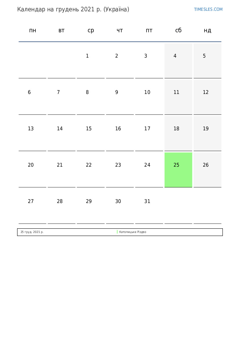 Завантажте та роздрукуйте календар PDF зі святами та вихідними на грудень 2021 року для України