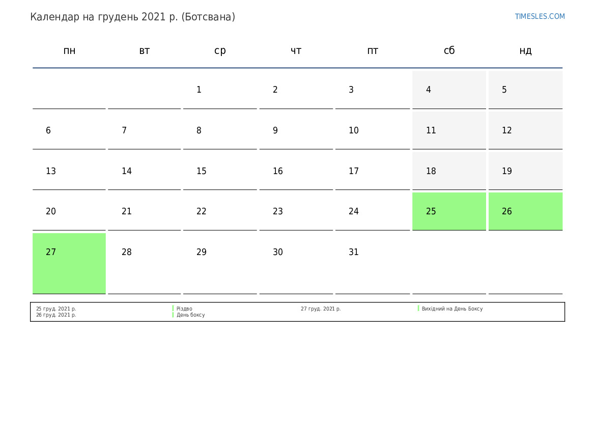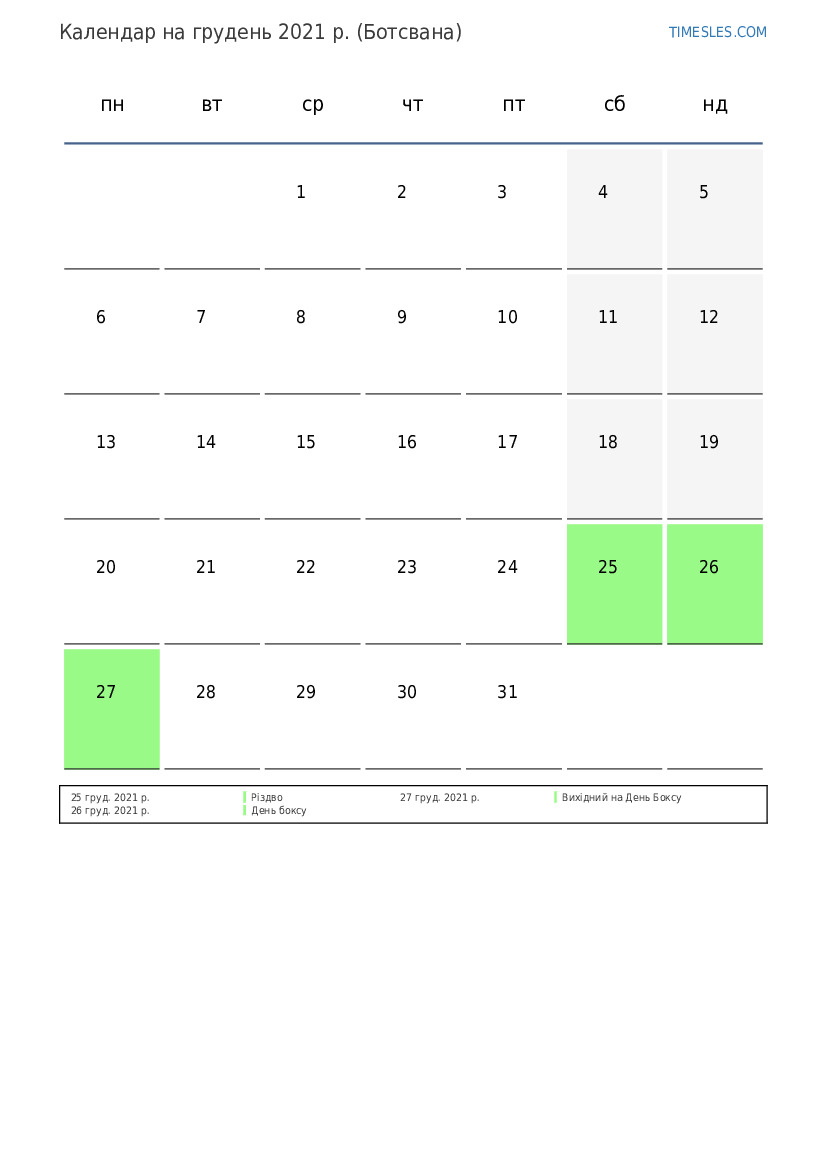 Завантажте та роздрукуйте календар PDF зі святами та вихідними на грудень 2021 року для Ботсвани