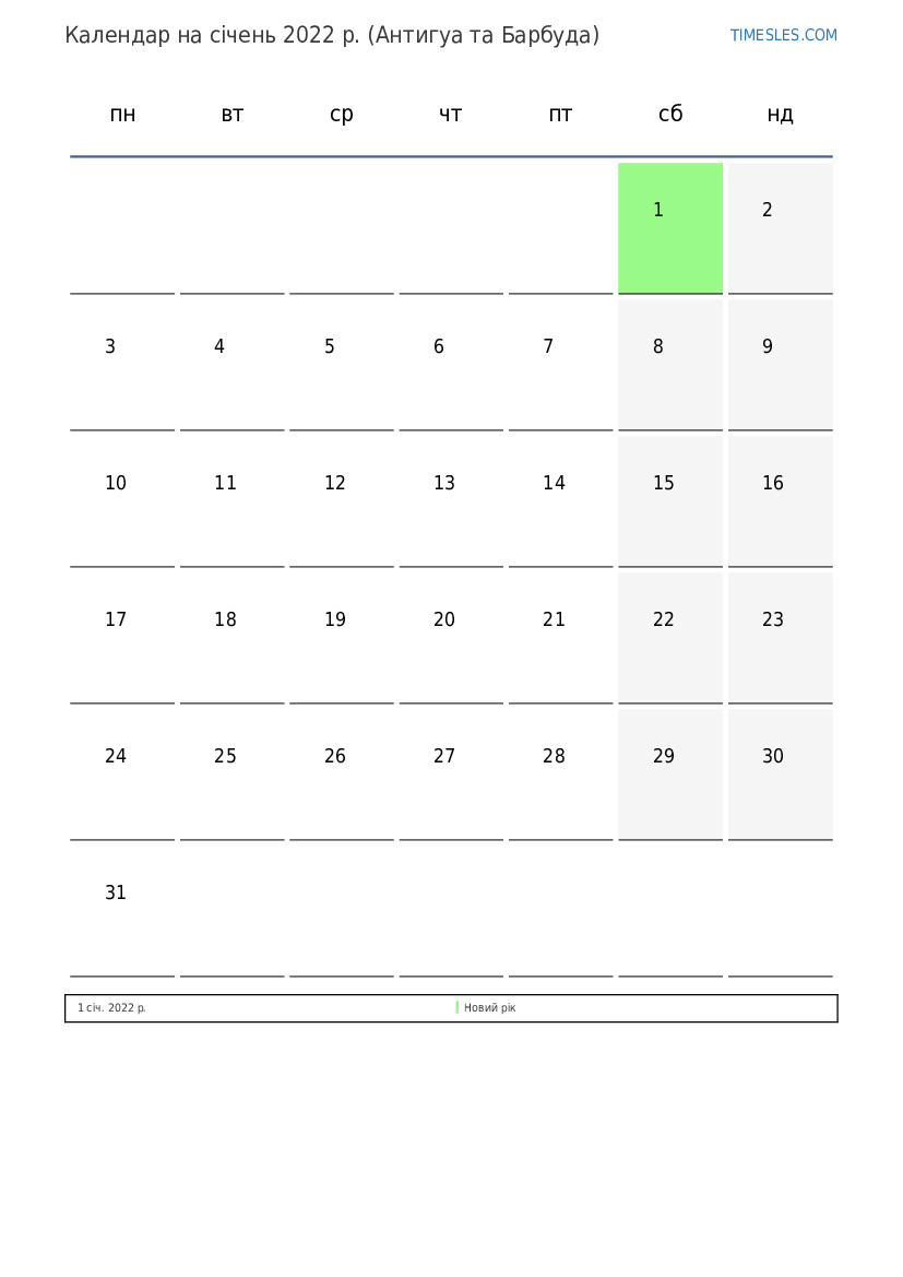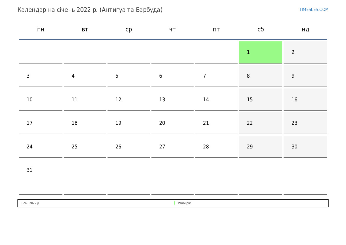 Календар на січень 2022 року для Антигуа та Барбуди