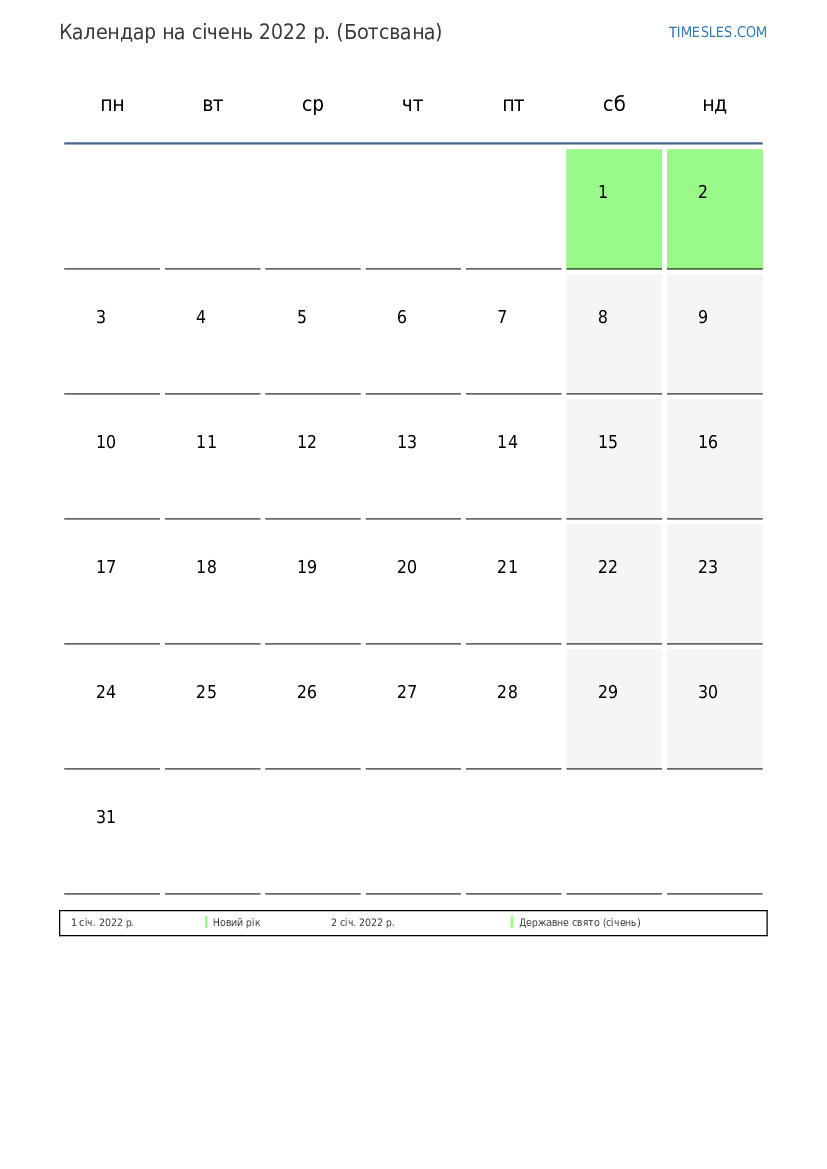 Календар свят та вихідних на січень 2022 року для Ботсвани