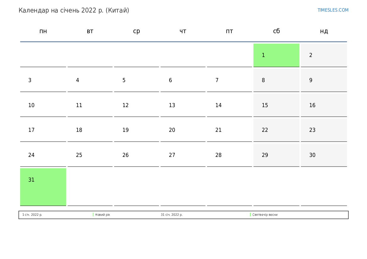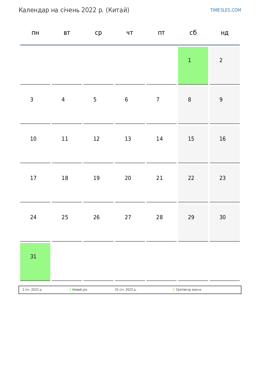 Завантажте та роздрукуйте календар PDF зі святами та вихідними на січень 2022 року для Китаю