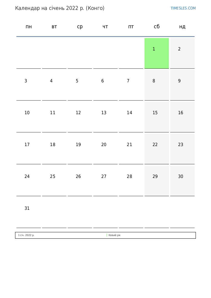 Календар на січень 2022 року для Конго