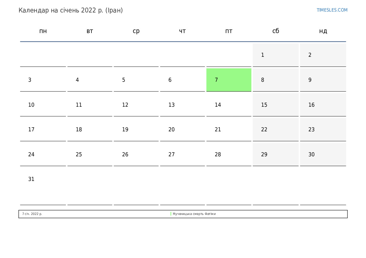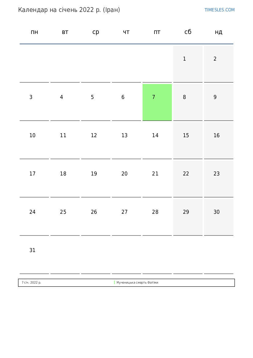 Завантажте та роздрукуйте календар PDF зі святами та вихідними на січень 2022 року для Ірану