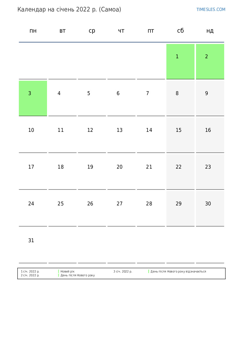 Завантажте та роздрукуйте календар PDF зі святами та вихідними на січень 2022 року для Самоа